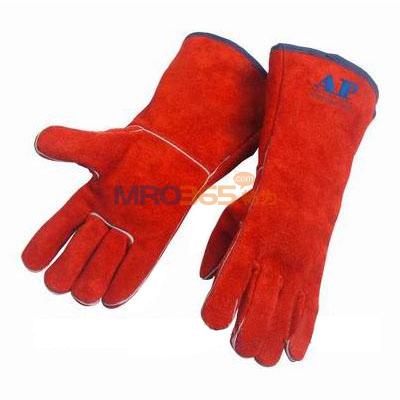 銹橙色牛二層皮全皮電焊手套,斜拇指護縫設計,適用于焊接、切割及搬運等用途。